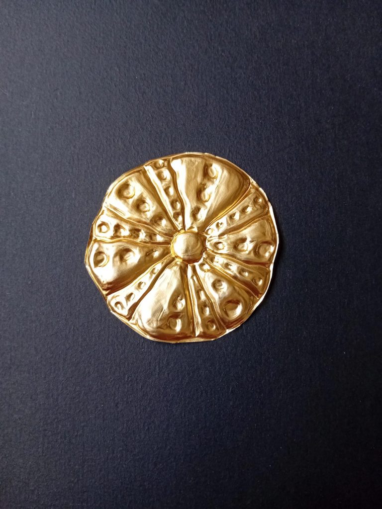 - Le métal repoussé : C’est un travail de patience. À l’aide d’un stylet, je viens presser la matière pour créer du relief et des motifs tout en finesse. C’est un dialogue entre la main et le métal.